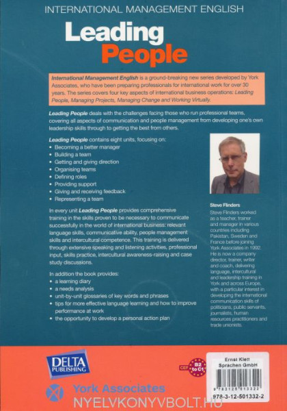 Nyolc egység a következőkre összpontosít:Jobb menedzserré válásCsapatépítésIrányítás és utasításSzervezésSzerepek meghatározásaTámogatás biztosításaKölcsönös visszajelzésCsapatképviseletA Leading People minden egységével átfogó képzést nyújt sikeres kommunikációhoz a nemzetközi üzleti világban: biztosítja a megfelelő nyelvi készségeket, a kommunikációs képességet, az emberek irányítási képességét és az interkulturális kompetenciát felölelő témaköröket. Ezt a képzési program a beszéd- és hallás utáni megértés fejlesztését helyezi előtérbe, mindezt szakmai témakörökön, készségfejlesztési gyakorlaton, interkulturális tudatosságnövelésen és esettanulmányok feldolgozásán keresztül.A könyv további kiegészítései:audió CDolvasónaplószükségletelemzéskulcsszavak és kifejezések tára egységek szerinttippek a hatékonyabb nyelvtanuláshoz és a teljesítménynöveléshezlehetőség a személyre szabott ütemterv készítéséhez