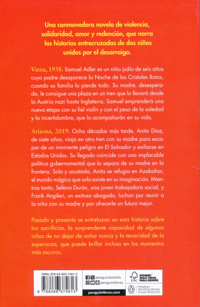 Su madre, desesperada, le consigue una plaza en un tren que le llevará desde la Austria nazi hasta Inglaterra. Samuel emprende una nueva etapa con su fiel violín y con el peso de la soledad y la incertidumbre, que lo acompanarán siempre en su dilatada vida.Arizona, 2019. Ocho décadas más tarde, Anita Díaz, de siete anos, sube con su madre a bordo de otro tren para escapar de un inminente peligro en El Salvador y exiliarse en Estados Unidos. Su llegada coincide con una nueva e implacable política gubernamental que la separa de su madre en la frontera. Sola y asustada, lejos de todo lo que le es familiar, Anita se refugia en Azabahar, el mundo mágico que solo existe en su imaginación. Mientras tanto, Selena Durán, una joven trabajadora social, y FrankAngileri, un exitoso abogado, luchan por reunir a la nina con su madre y por ofrecerle un futuro mejor.