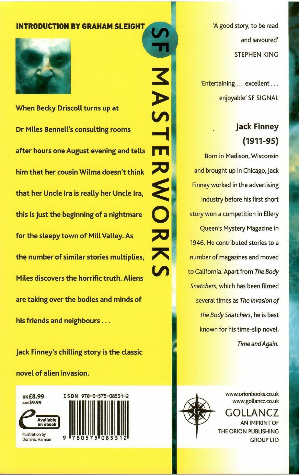 Originally published in 1955 Jack Finney's sinister SF tale has outgrown the initial debate about whether it satirized Communism or the conformity of US society at the time, to become a classic of paranoia; an examination of our fear of 'the other'.
