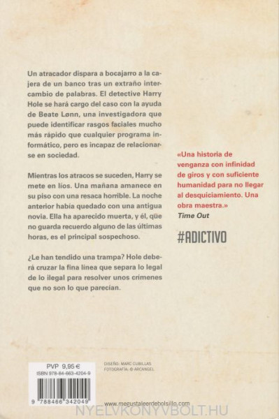 Las cámaras de seguridad de un banco captan cómo un atracador dispara a bocajarro a la cajera tras un extrano intercambio de palabras. El detective Harry Hole se hará cargo de la investigación, con la ayuda de Beate Lonn, una de las investigadoras más desconcertantes del cuerpo de policía, capaz de identificar rasgos faciales mucho más rápido que cualquier programa informático, pero incapaz de moverse en sociedad.Todas las pesquisas remiten a Raskol Baxhet, un legendario atracador. Sin embargo, es imposible que sea el culpable porque cumple condena en prisión. Y, mientras los atracos se suceden cada vez con más virulencia, Harry se mete en líos. Una manana amanece en su piso con una resaca horrible que le hace revivir viejos temores. La noche anterior había quedado con una antigua novia que aparece muerta. Él es el principal sospechoso, a menos que logre aclarar qué ha hecho durante esas últimas horas de las que no recuerda nada.