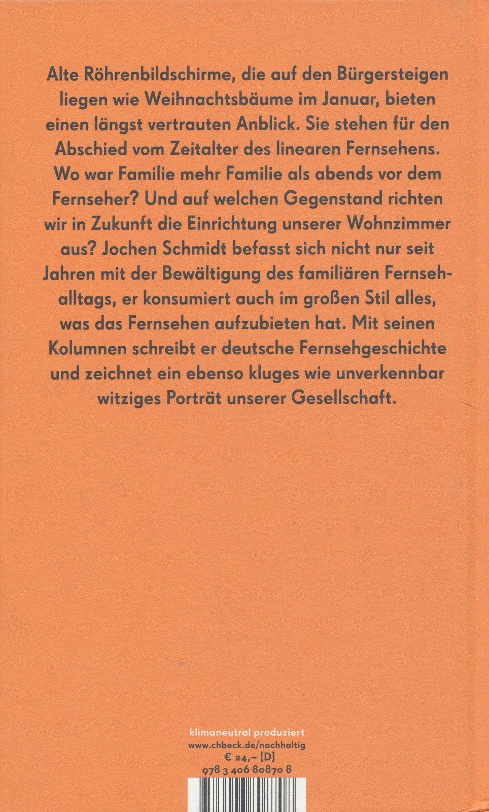 Sie stehen für den Abschied vom Zeitalter des linearen Fernsehens. Wo war Familie mehr Familie als abends vor dem Fernseher? Und auf welchen Gegenstand richten wir in Zukunft die Einrichtung unserer Wohnzimmer aus? Jochen Schmidt befasst sich nicht nur seit Jahren mit der Bewältigung des familiären Fernsehalltags, er konsumiert auch im großen Stil alles, was das Fernsehen aufzubieten hat. Mit seinen Kolumnen schreibt er deutsche Fernsehgeschichte und zeichnet ein ebenso kluges wie unverkennbar witzigesPorträt unserer Gesellschaft.