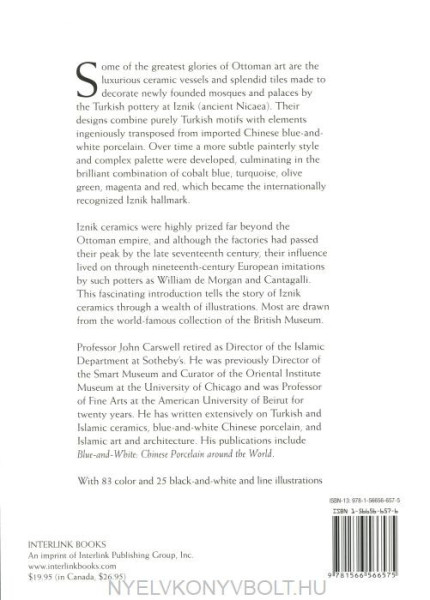 Their designs combine purely Turkish motifs with elements ingeniously transposed from imported Chinese blue-and-white porcelain. Over time a more subtle painterly style and complex palette were developed, culminating in the brilliant combination of cobalt blue, turquoise, olive green, magenta, and red that became the internationally recognized Iznik hallmark. Iznik ceramics were highly prized far beyond the Ottoman Empire, and although the factories had passed their peak by the late seventeenth century, their influence lived on through nineteenth-century European imitations by such potters as William de Morgan and Cantagalli.