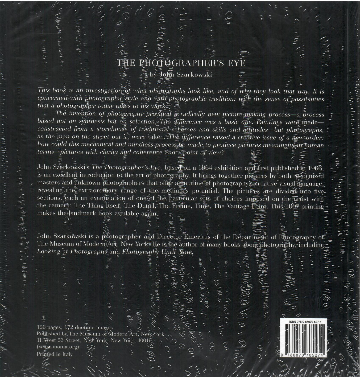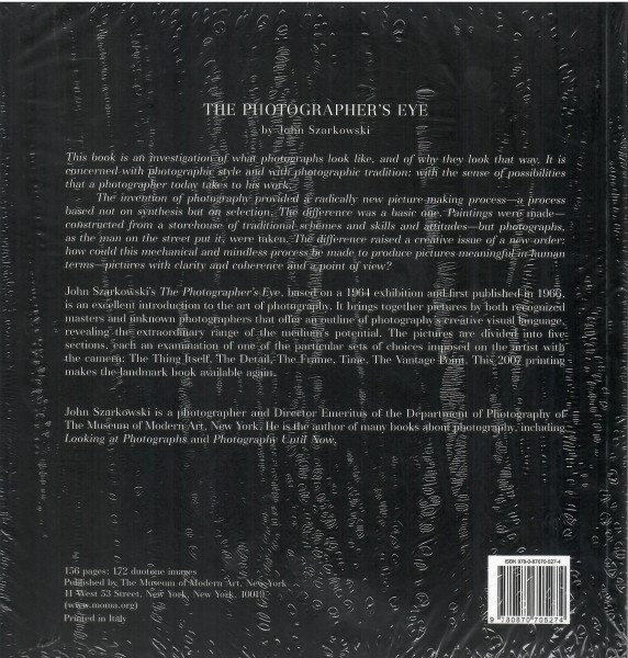 The Photographer’s Eye, available again after some years out of print, offers a guide to the medium’s visual language through works by such early masters as Atget, Cartier-Bresson, Evans, Strand and Weston. In this re-issue, 172 illustrations reveal theextraordinary range of the photograph from the early days of the medium’s development to the mid-1960s. They are accompanied by an essay from Szarkowski, one of the most influential photography curators and critics of our time.