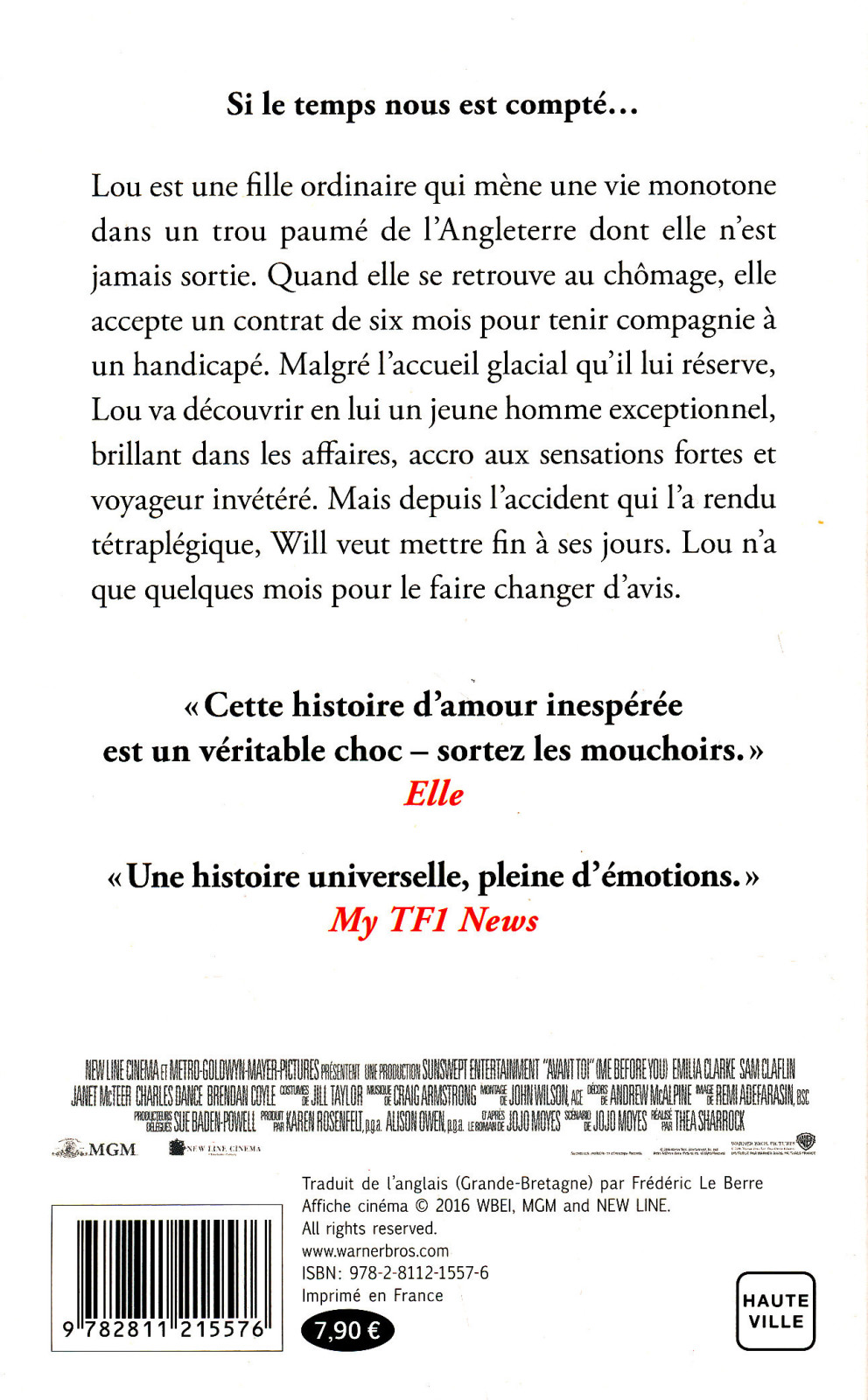 Lou est une fille ordinaire qui mene une vie monotone dans un trou paumé de l’Angleterre dont elle n’est jamais sortie. Quand elle se retrouve au chômage, elle accepte un contrat de six mois pour tenir compagnie a un handicapé. Malgré l’accueil glacial qu’il lui réserve, Lou va découvrir en lui un jeune homme exceptionnel, brillant dans les affaires, accro aux sensations fortes et voyageur invétéré. Mais depuis l’accident qui l’a rendu tétraplégique, Will veut mettre fin a ses jours. Lou n’a que quelques mois pour le faire changer d’avis.