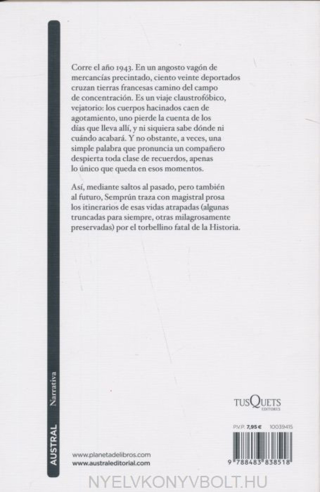 Corre el ano 1943. En un angosto vagón de mercancías precintado, ciento veinte deportados cruzan tierras francesas camino del campo de concentración. Es un viaje claustrofóbico, vejatorio: los cuerpos hacinados caen de agotamiento, uno pierde la cuentade los días que lleva allí, y ni siquiera sabe dónde ni cuándo acabará el viaje.