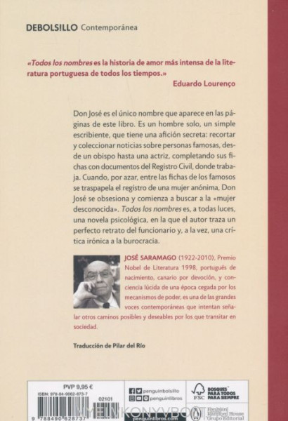 En el ambiente opresivo, cerrado y polvoriento de la Conservaduría General del Registro Civil trabaja como escribiente don José, un soltero solitario que un buen día decide crear su particular registro de personas famosas. No contento con los datos que le proporcionan periódicos y revistas, resuelve completarlos con los que posee, tan a mano, en el Registro. Para ello no tendrá más remedio que violar alguna de las normas de la Conservaduría.La crítica ha dicho...«Todos los nombres es la historia de amor más intensa de la literatura portuguesa de todos los tiempos.»Eduardo Lourenço«Como Günter Grass o Ces Nooteboom, Saramago aspira a enlazar con un público que desborde límites nacionales.»El País