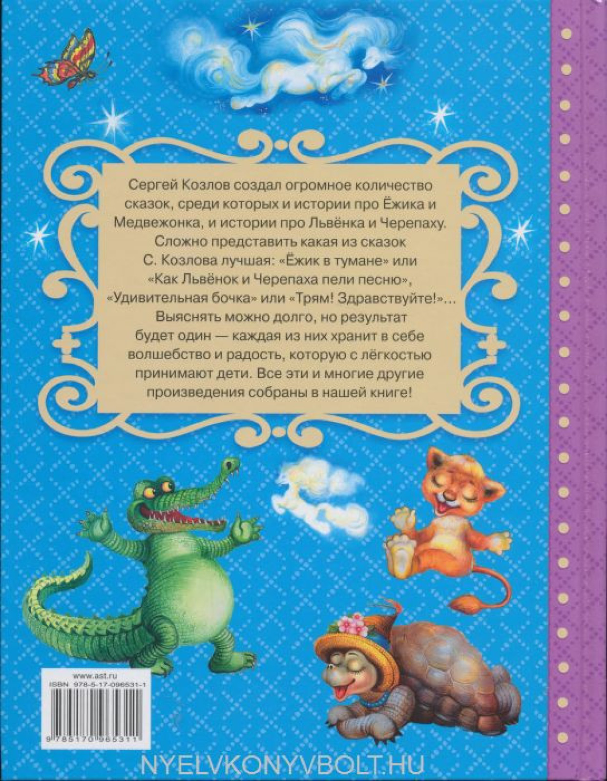 Sergej Grigorevich Kozlov (22.08.1939 - 09.01.2010) - pisatel-skazochnik, poet, laureat premii im. K. Chukovskogo. Sergeja Kozlova, prezhde vsego, znajut, kak avtora skazok «Jozhik v tumane», «Porosjonok v koljuchej shube», «Kak Lvjonok i Cherepakha peli pesnju» po kotorym byli snjaty multfilmy. No v bagazhe pisatelja est mnogo istorij, kotorye proiskhodjat s ljubimymi gerojami za kadrom. Eti i mnogie drugie istorii i sobrany v nashej knige.Dlja srednego i starshego doshkolnogo vozrasta.