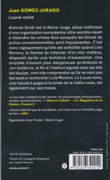 Antonia Scott n'a peur de rien, sauf d'elle-meme.Antonia Scott est la piece maîtresse du projet Reine rouge, créé pour résoudre les crimes les plus complexes. Un soir, elle et Jon Gutiérrez, un flic a l'instinct aiguisé, sont sollicités sur une affaire urgente : la disparition d'une femme étroitement liée a un clan mafieux actif a Malaga. Cette derniere, apres avoir échappé a une tentative d'assassinat, s'est évaporée dans la nature. Mais les deux agents ne sont pas les seuls a vouloir la retrouver.En effet, celle qui répond au nom de Louve noire, une dangereuse tueuse a gages a la solde de la mafia russe, est également sur ses traces... Des paysages ensoleillés de l'Andalousie aux décors enneigés de la Sierra, Antonia Scott, toujours en proie a ses démons, devra affronter cette terrible rivale.