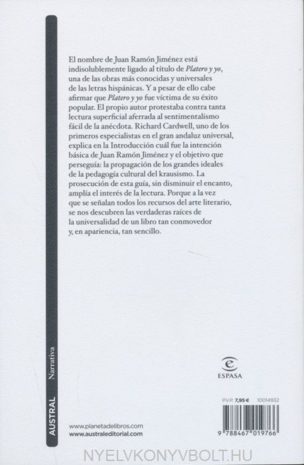 Y, a pesar de ello, cabe afirmar que Platero y yo ha sido víctima de su éxito popular. El propio Juan Ramón protestaba en vida contra tanta lectura superficial aferrada al sentimentalismo fácil de la anécdota. Richard Cardwell, uno de los primeros especialistas en el gran andaluz universal, autor de una obra decisiva sobre la formación modernista de Juan Ramón Jiménez, explica en la Introducción cuál ha sido la intención básica de aquél y el objetivo que perseguía: la propagación de los grandes idealesde la pedagogía cultural del krausismo. La prosecución de esta guía, sin disminuir el encanto, amplía el interés de la lectura. Porque a la vez que se senalan todos los recursos del arte literario, se nos descubren las verdaderas raíces de la universalidad de un libro tan conmovedor y, en apariencia, tan sencillo.