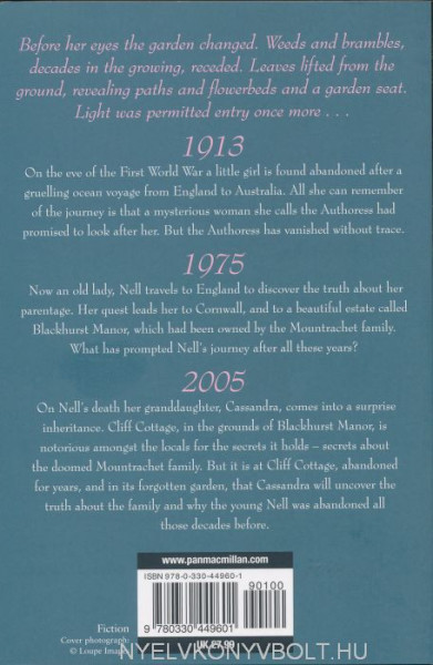 A tiny girl is abandoned on a ship headed for Australia in 1913. She arrives completely alone with nothing but a small suitcase containing a few clothes and a single book—a beautiful volume of fairy tales. She is taken in by the dockmaster and his wife and raised as their own. On her twenty-fi rst birthday, they tell her the truth, and with her sense of self shattered and very little to go on, "Nell" sets out to trace her real identity. Her quest leads her to Blackhurst Manor on the Cornish coast and the secrets of the doomed Mountrachet family. But it is not until her granddaughter, Cassandra, takes up the search after Nell’s death that all the pieces of the puzzle are assembled.