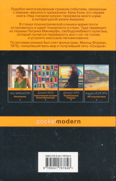 Liberalizm protiv traditsionalizma, lichnost protiv ustoev. Roman potrjasaet glubinoj, volnuet, zastavljaet zadumatsja o zhizni, o spravedlivosti, o sisteme i ee nepogreshimosti, o granitsakh bezumija i normalnosti, o svobode, o vole, o vybore. Chitat objazatelno. A takzhe smotret film "Proletaja nad gnezdom kukushki" s Dzhekom Nikolsonom v glavnoj roli. Po motivam romana takzhe postavleno mnozhestvo spektaklej v raznykh stranakh, v tom chisle v Rossii. "Nad gnezdom kukukhi" - eto gruboe i opustoshajusche chestnoe izobrazhenie granits mezhdu zdravomysliem i bezumiem. "Esli kto-nibud zakhochet oschutit puls nashego vremeni, pust chitaet Kizi. I esli vse budet khorosho i ne izmenitsja porjadok veschej, ego budut chitat i v sledujuschem veke", - pisali vgazete "Los-Andzheles Tajms". Dejstvitelno, i v nashi dni kniga prodolzhaet zhit i ne terjaet svoej sumasshedshej populjarnosti. Novyj perevod sdelal molodoj talantlivyj perevodchik Dmitrij Shepelev.