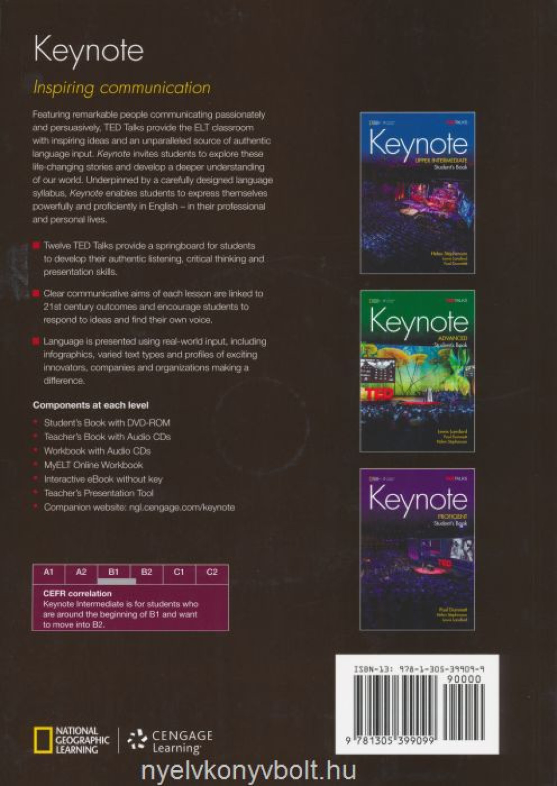 Twelve TED Talks provide a springboard for students to develop their authentic listening, critical thinking and presentation skills. Clear communicative aims of each lesson are linked to 21st century outcomes and encourage students to respond to ideas and find their own world. Language is presendet using real-world input, including infographics, varied text types and profiles of exciting innovators, companies and organizations making a difference.