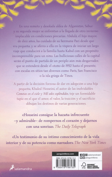 La decisión de una humilde familia campesina de dar una hija en adopción a un matrimonio adinerado es el fundamento sobre el que Khaled Hosseini -autor de las inolvidables Cometas en el cielo y Mil soles espléndidos- ha tejido este formidable tapiz en el que se entrelazan los destinos de varias generaciones y se exploran las infinitas formas en que el amor, el valor, la traición y el sacrificio desempenan un papel determinante en las vidas de las personas. La historia arranca en una remota y desolada aldea de Afganistán, donde Sabur y su segunda mujer se enfrentan en condiciones precarias a la llegada de otro invierno implacable.