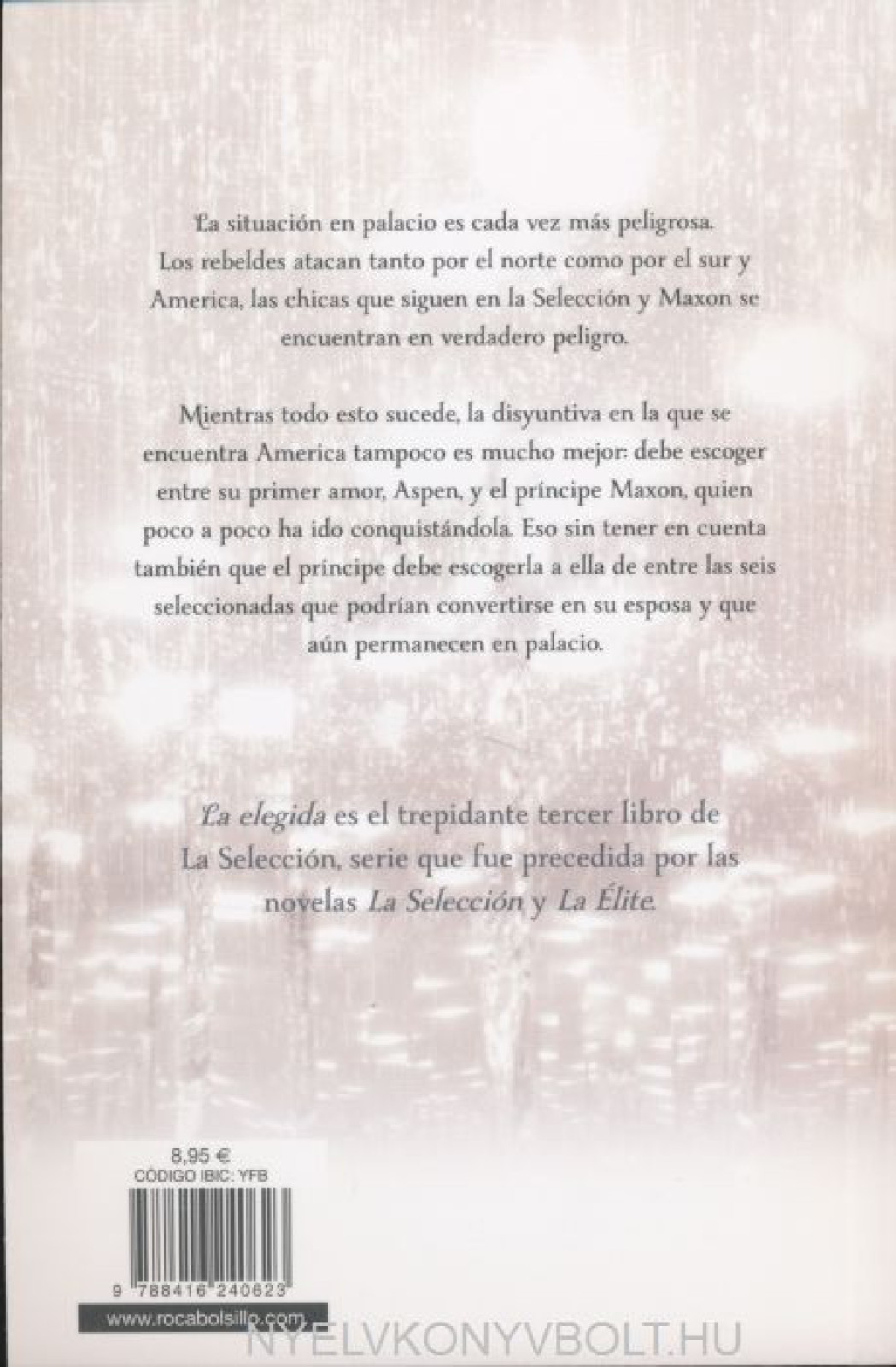 Eso sin tener en cuenta que el príncipe debe escogerla a ella también de entre las seis seleccionadas que podrían convertirse en su esposa y que aún permanecen en palacio. Luchas políticas, amor, violencia, dudas… America deberá tomar decisiones que cambiarán el curso no solo de su vida, sino de todo aquel que la rodea.La elegida es el trepidante desenlace de la trilogía La selección.