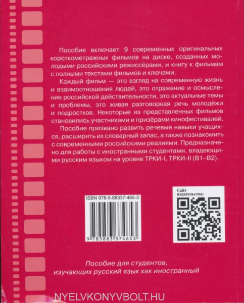Kazhdyj film — eto vzgljad na sovremennuju zhizn i vzaimootnoshenija ljudej, eto otrazhenie i osmyslenie rossijskoj dejstvitelnosti, eto aktualnye temy i problemy, eto zhivaja razgovornaja rech molodjozhi i podrostkov. Nekotorye iz predstavlennykh filmov stanovilis uchastnikami i prizjorami kinofestivalej.Posobie prizvano razvit rechevye navyki uchaschikhsja, rasshirit ikh slovarnyj zapas, a takzhe poznakomit s sovremennymi rossijskimi realijami. Prednaznacheno dlja raboty s inostrannymi studentami, vladejuschimi russkim jazykom na urovne TRKII, TRKIII (B1–B2).