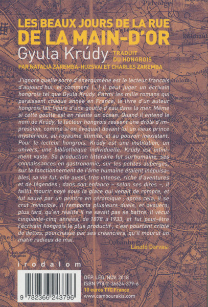 Parmi les mille romans qui paraissent chaque année en France, le livre d’un auteur hongrois fait figure d’une goutte d’eau dans la mer. Meme si cette goutte est en réalité un océan. Quand il entend le nom de Krúdy, le lecteur hongrois ressent une drôled’impression, comme si on évoquait devant lui un vieux prince mystérieux, au royaume illimité, et au pouvoir inexistant.Pour le lecteur hongrois, Krúdy est une institution, un univers, une bibliotheque individuelle. Krúdy est infiniment vaste. Sa production littéraire fut surhumaine, ses connaissances en gastronomie, sur les petites auberges, sur le fonctionnement de l’âme humaine étaient inépuisables, sa vie fut, elle aussi, tres intense, riche d’aventures et de légendes ; dans son enfance – selon ses dires –, il faillit mourir noyé sous la glace qui venait de rompre, et fut sauvé par un peintre en céramique ; apres cela, il se crut invincible... László Darvasi