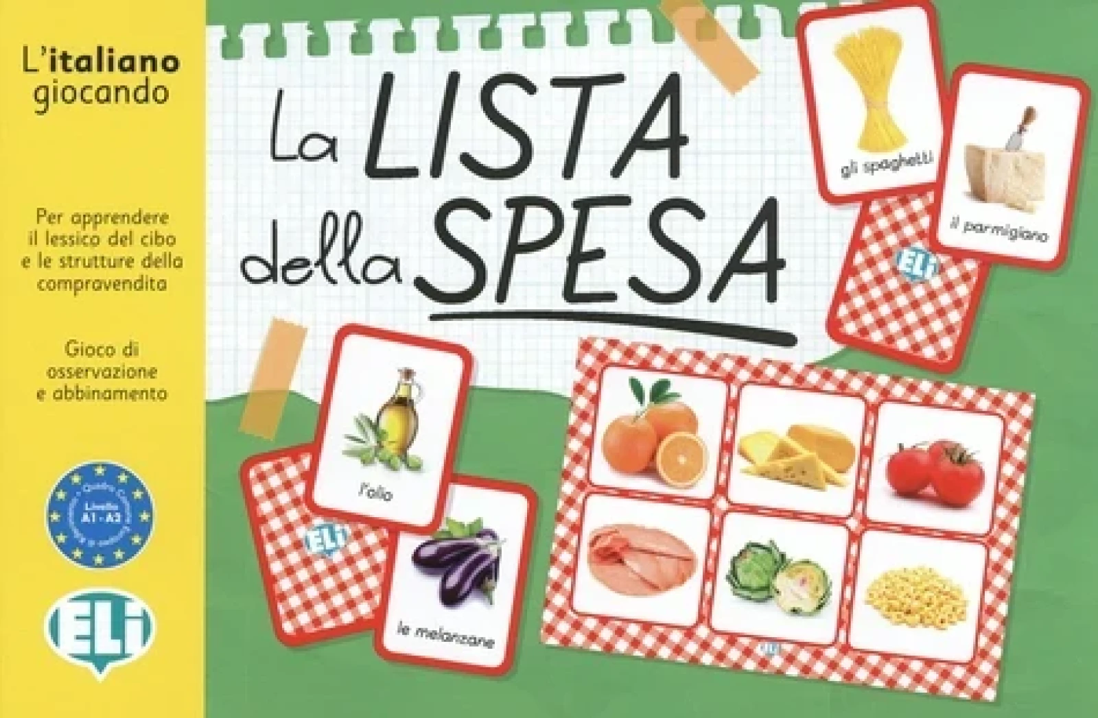 ,...presentando cibi e bevande all'interno di una situazione stimolante e divertente come la compravendita. Il gioco é composto da: un mazzo di 66 carte fotografiche, 36 liste della spesa da un lato e sul retro le cartelle per il gioco della Tombola, una guida. La guida contiene le istruzioni, suggerimenti per ulteriori attivitá, quiz gastronomici, ricette tipiche e una vasta gamma di modi di dire legati ai cibi.