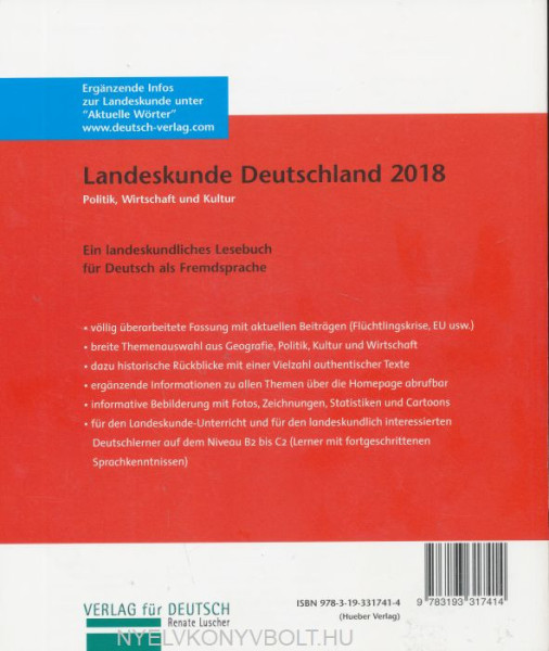 Niveau B2 bis C2- Deutschland heute mit Schwerpunkt auf Entwicklungen in Ost und West- Leseproben und aktuelle Infos zur Landeskunde unter www.deutsch-verlag.com- erscheint jährlich neu Seite für Seite aktualisiert- mit vielen neuen Fotos, Statistiken und Abbildungen- Stichwörter aus der aktuellen Landeskunde: Zuwanderung, Flüchtlingskrise, Helferkreise, Rechtsextremismus, bürgerliches Engagement, Krise Europas, atypische Beschäftigung, Mindestlohn, Theater und Politik, alternative Energien