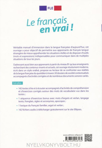 Contenu* 50 séquences réparties en 10 grands themes* 142 textes a lire et a écouter accompagnés d’activités de compréhension et d’exercices autour des mots de vocabulaire vus dans les textes* 1 séquence d’exercices bonus avec mots d’argots et verlan, langage texto, franglais, sigles et acronymes, apocopes* 1 lexique du français familier, argot et verlan* 142 fichiers audioa télécharger gratuitement sur le site Ellipses* corrigés