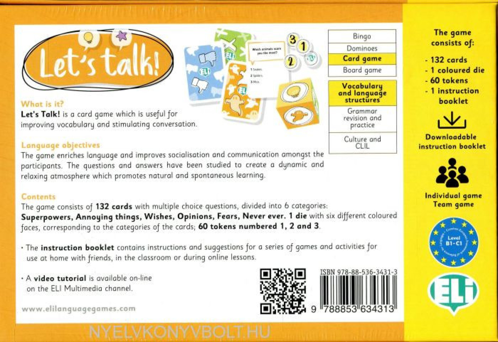 The cards are subdivided into six categories: superpowers, annoying things, wishes, opinions, fears, never ever• 1 multi-coloured dice with six sides corresponding to the colours of the six categories of cards• 60 numbered tokens divided up as number 1, number 2 and number 3• 1 instruction booklet with instructions and suggestions