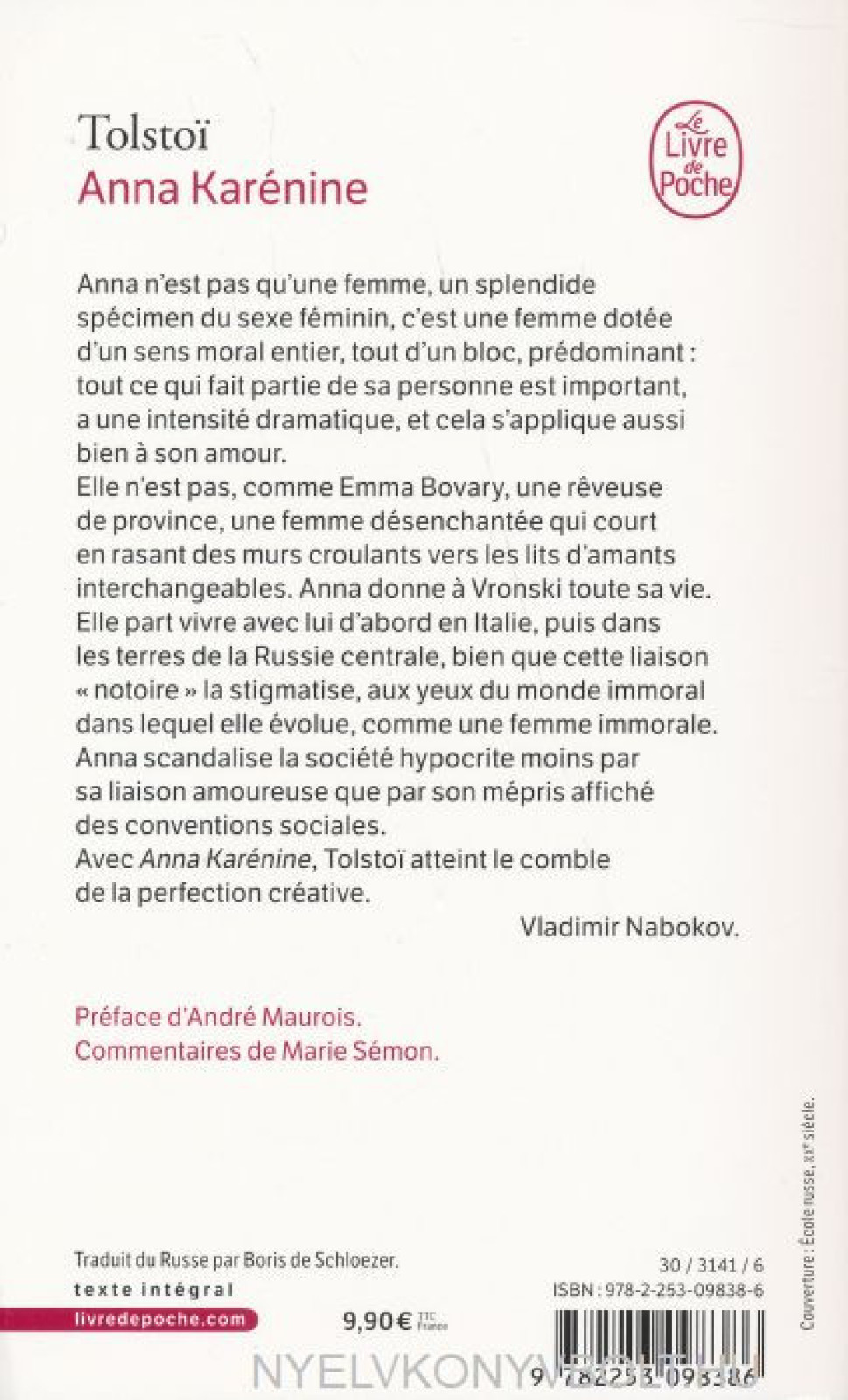 tout ce qui fait partie de sa personne est important, a une intensité dramatique, et cela s'applique aussi bien a son amour.Elle n'est pas, comme Emma Bovary, une reveuse de province, une femme désenchantée qui court en rasant des murs croulants vers les lits d'amants interchangeables. Anna donne a Vronski toute sa vie.Elle part vivre avec lui d'abord en Italie, puis dans les terres de la Russie centrale, bien que cette liaison « notoire » la stigmatise, aux yeux du monde immoral dans lequel elle évolue, comme une femme immorale. Anna scandalise la société hypocrite moins par sa liaison amoureuse que par son mépris affiché des conventions sociales.Avec Anna Karénine, Tolstoi atteint le comble de la perfection créative.Vladimir Nabokov.