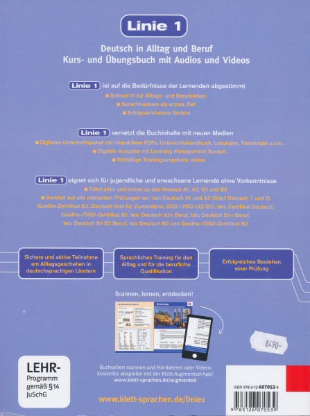 Das Deutschlehrwerk zeichnet sich durch lineare Lernwege und ein breites Angebot an Differenzierungsmöglichkeiten für heterogene Lernergruppen aus. Durch regelmäßige Aktivierung und Individualisierung des Gelernten führt Linie 1 zu stetigen Erfolgserlebnissen beim Deutsch lernen und motiviert zum eigenen Sprachhandeln außerhalb des Deutschkurses. Der Gesamtband Linie 1 A1 führt zur Niveaustufe A1 und bereitet auf die Prüfung telc Deutsch A1 (Start Deutsch 1) vor.