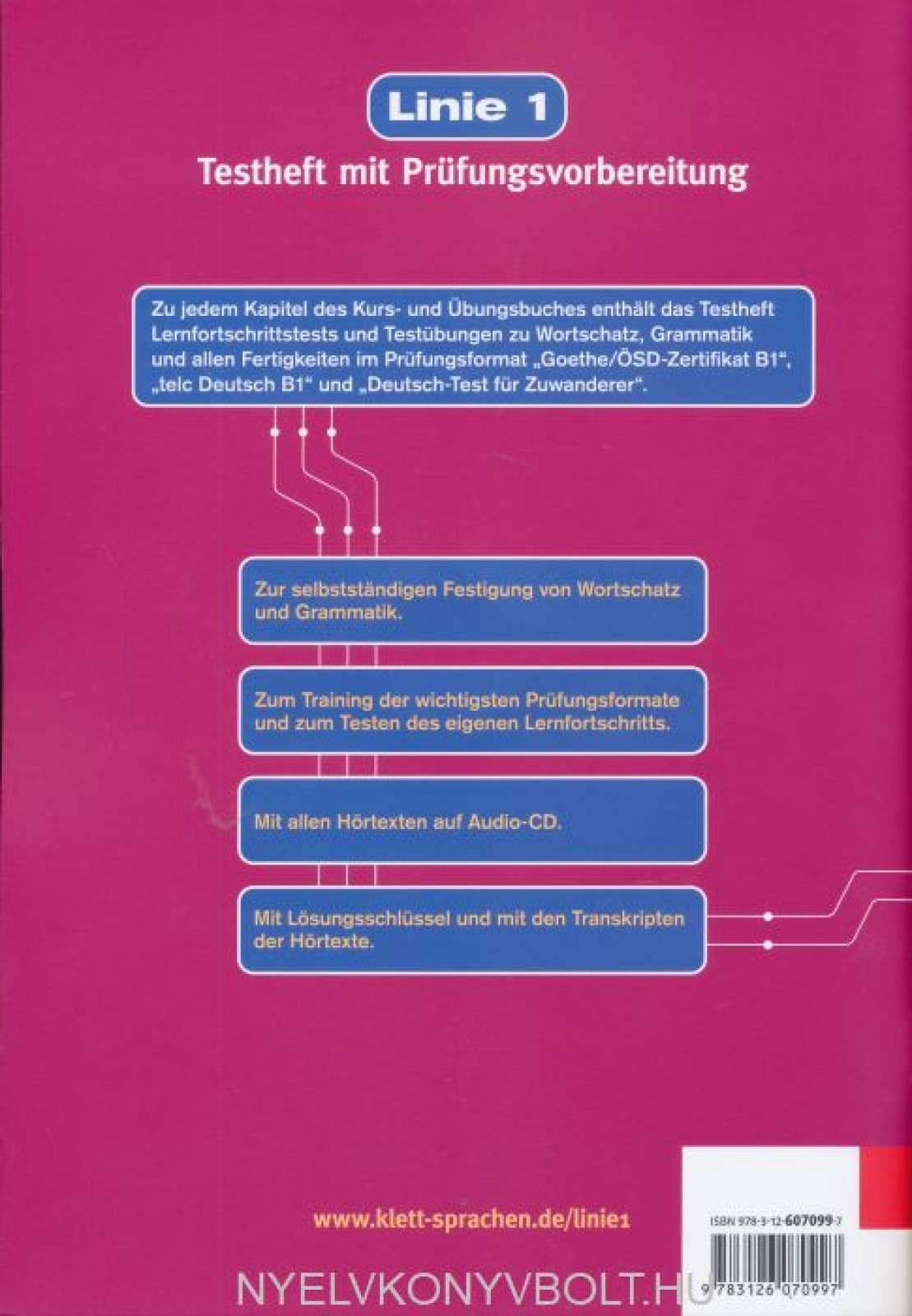 Das Testheft enthält Tests zu jedem Kapitel des Kurs- und Übungsbuchs Linie 1 B1. Es bereitet auf die Prüfungen Deutsch-Test für Zuwanderer, telc Zertifikat Deutsch und Goethe-/ÖSD-Zertifikat B1 vor. Mit Audio-CD.