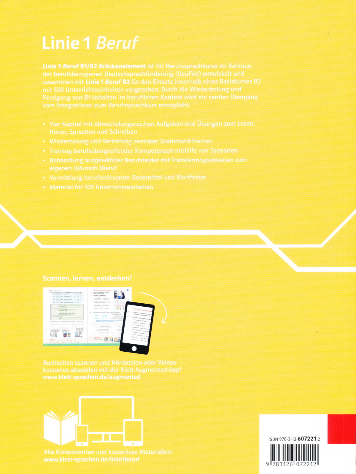 Linie 1 Beruf B1/B2 Brückenelement ist im Rahmen der bundesweiten berufsbezogenen Deutschsprachförderung (DeuFöV) entwickelt und zusammen mit Linie 1 Beruf B2 für den Einsatz innerhalb eines Basiskurses B2 mit 500 Unterrichtseinheiten vorgesehen.
