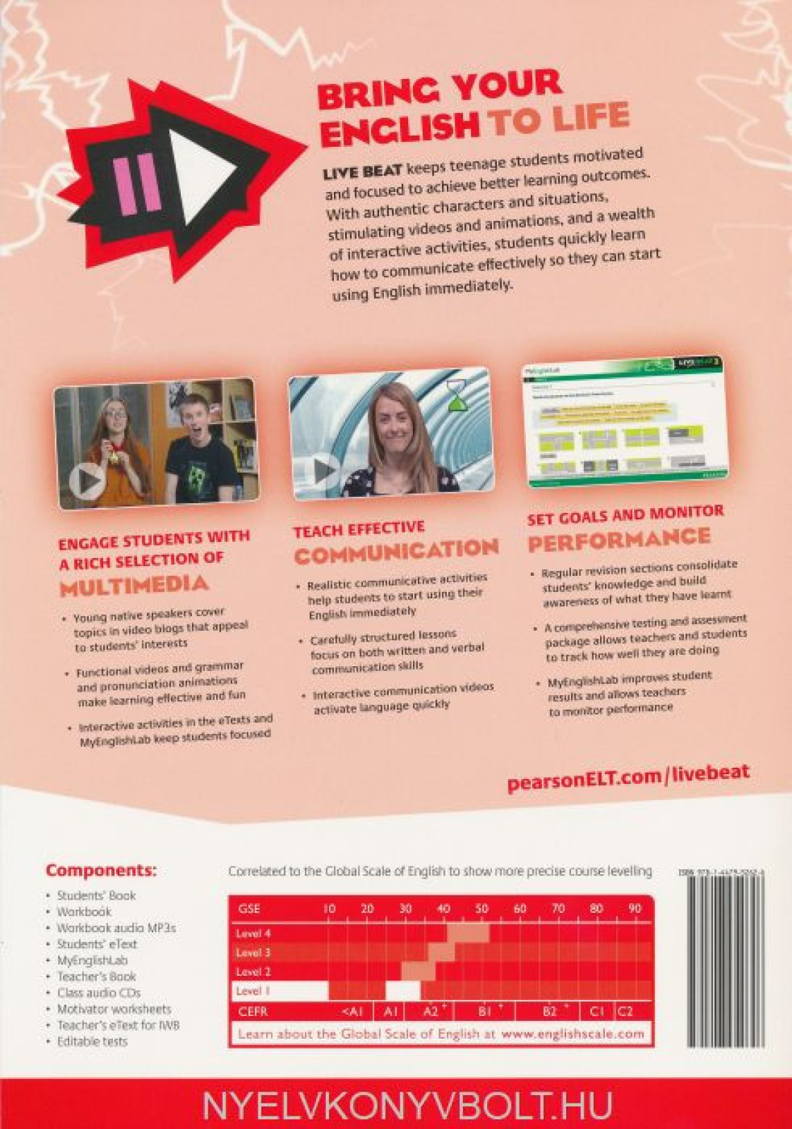 The Workbook follows the Students' Book structure:Exercises are at two levels of difficulty to cater for Mixed Ability Classes.Each input lesson ends with a Grammar Summary, with examples and simple rules. Language Round-Ups give extra practice and provide Self-check score boxes and an Audio answer key so students can check their knowledge.Skills Practice Pages focus on reading, writing and listening.Live Beat is a new four-level course that keeps teenage students motivated and focused to achieve better learning outcomes. It builds on the successful approach used by the same authors in the bestselling Upbeat course. Improvement in communication skills is measurable against the Global Scale of English. Workbook audio files available on www.english.com/livebeat