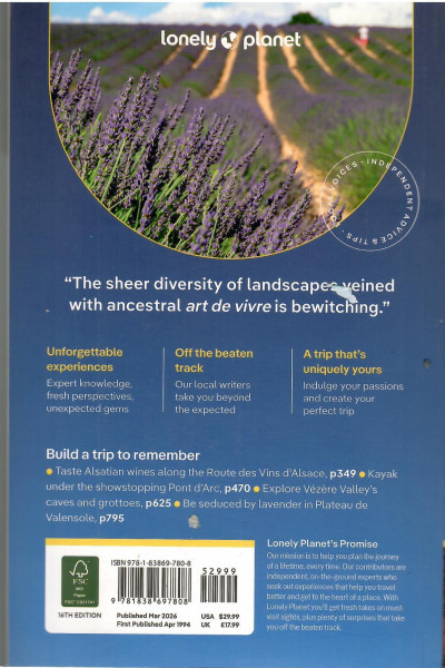 Discover France's most popular experiences and best kept secrets from cycling through one of the world's most famous vineyards along La Voie des Vignes; to drinking with the ghosts of Simone de Beauvoir and Ernest Hemingway on place de la Contrescarpe in Paris' Latin Quarter; and marvelling at spellbinding fountain displays and equestrian shows at Unesco-listed Château de Versailles.Build a trip to remember with Lonely Planet's France travel guide:Our classic guidebook format contains the most comprehensive level of information for planning multi-week tripsAll-new structure and design that's easy to use so you can navigate France effortlesslyExciting itineraries help you create your perfect adventure with suggestions for extended journeys,day trips, walking tours and activity-led excursionsExpert local recommendations on eating, drinking, nightlife, shopping, accommodation, festivals, when to go and moreVibrant photography and maps including a pull-out map of Paris