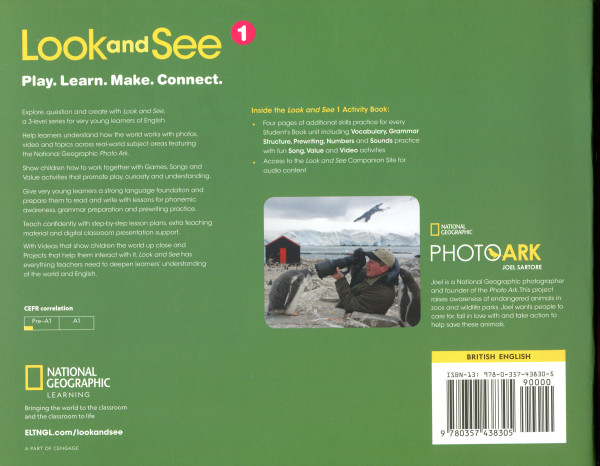 Help learners understand how the world works withphotos, video, and topics across real-world subject areas,featuring the National Geographic Photo Ark.Show children how to work together with Games, Songs andValue activities that promote play, curiosity, and understanding.Give very young learners a strong language foundation and prepare them to read and write with lessons for phonemic awareness, grammar preparation, and prewriting practice.Teach confidently with step-by-step lesson plans, extra teaching material,and comprehensive digital classroom presentation support.With Videos that show children the world up close and Projects that allow them to interact with it, Look and See has everything teachers need to help students play, learn, make, and connect and deepen their understanding of the world and English.