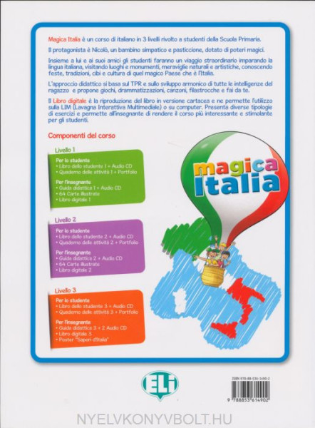 Nicolo, simpatico e pasticcione, seguira i ragazzi nel loro fantastico viaggio attraverso i luoghi, la cultura e le tradizioni della Magica Italia.• Corso strutturato sul metodo TPR (Total Physical Response).• Sezione di civilta in chiusura del percorso modulare arricchita da attivita interdisciplinari: canti, filastrocche, giochi e attivita fai da te.• Tante attivita da svolgere a casa o in classe: grammatica attiva, esercitazione del lessico e delle funzioni comunicative.• Guida didattica con libro digitale con tante risorse, quali le carte illustrate in versione PDF, accesso digitale e gratuito alla rivista Volare e tante attivita “fai-da-te” stampabili.• Carte illustrate. • Poster Sapori d'Italia: poster illustrato sulle tradizioni culinarie delle regioni italiane.