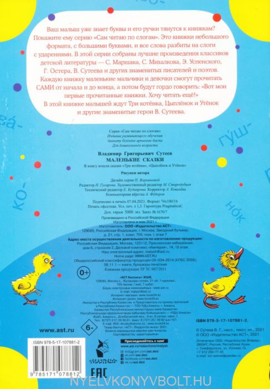 V etoj serii sobrany luchshie proizvedenija klassikov detskoj literatury - S. Marshaka, S. Mikhalkova,E. Uspenskogo, G. Ostera, V. Suteeva i drugikh znamenitykh pisatelej i poetov.Kazhduju knizhku malenkie malchiki i devochki smogut prochitat SAMI ot nachala i do kontsa, a potom budut gordo govorit: "Vot moi pervye prochitannye knizhki. Khochu chitat eschjo!"V etoj knizhke malyshej zhdut Tri kotjonka, Tsypljonok i Utjonok i drugie znamenitye geroi V. Suteeva.