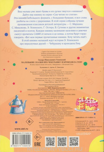 V etoj serii sobrany luchshie proizvedenija klassikov detskoj literatury — S. Marshaka, S. Mikhalkova, E. Uspenskogo, G. Ostera, V. Suteeva i drugikh znamenitykh pisatelej i poetov.Kazhduju knizhku malenkie malchiki i devochki smogut prochitat SAMI otnachala i do kontsa, a potom budut gordo govorit: "Vot moi pervye prochitannye knizhki. Khochu chitat eschjo!"V etoj knizhke malyshej zhdut istorii E. Uspenskogo pro nerazluchnykh druzej — Cheburashku i krokodila Genu.Dlja doshkolnogo vozrasta.