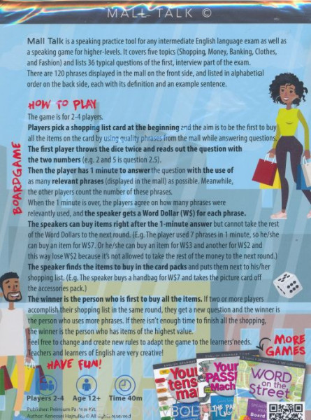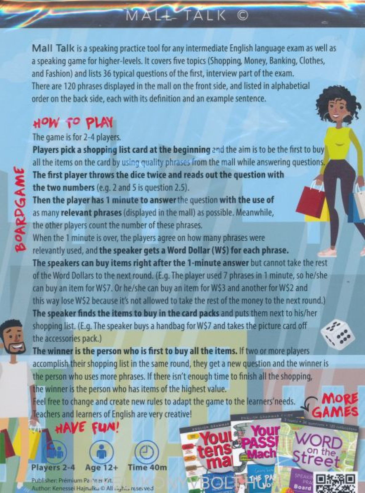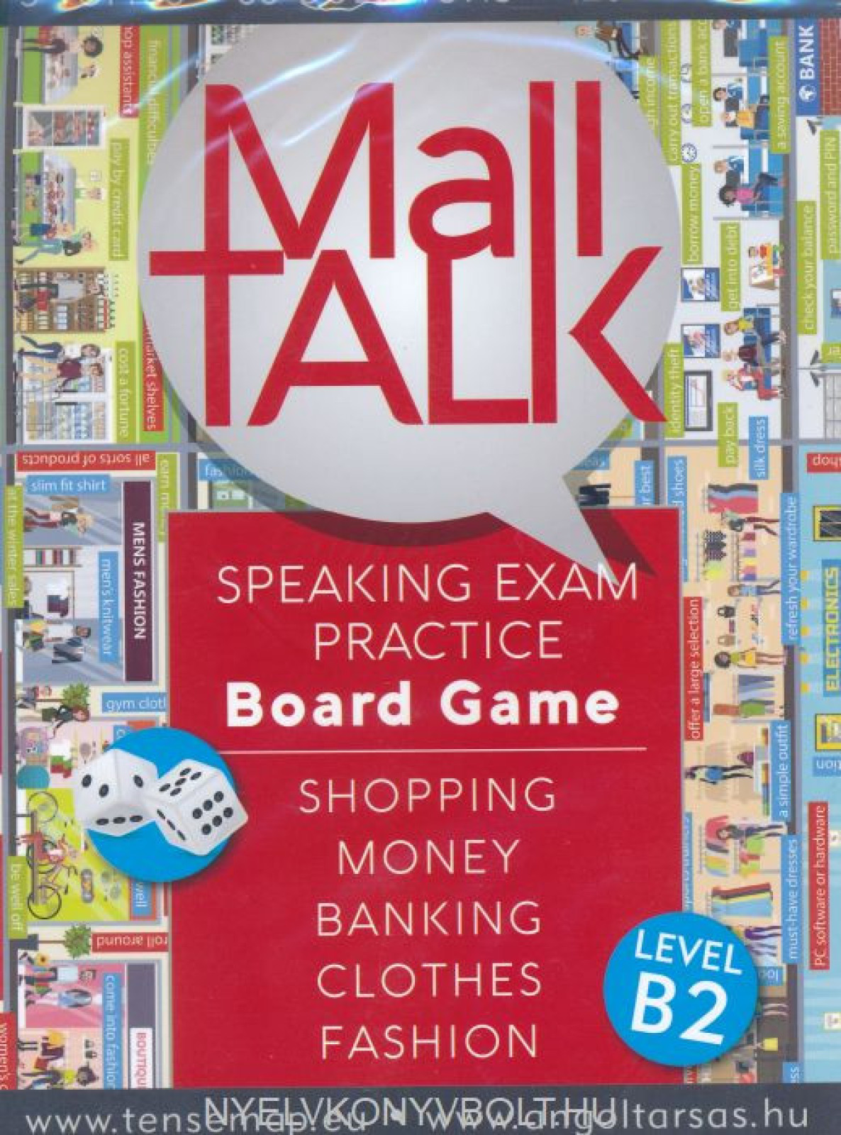 A Mall Talk egy beszédkészséget és szókincset fejlesztő társasjáték, amely a középfokú (B2) szóbelinyelvvizsgára készít fel, ugyanakkor hasznos fejlesztő játék B1 és C1 nyelvi szinten is. A játék öttémakört fed le (vásárlás, pénz, bank, ruhák és divat) és 36 tipikus kérdést tartalmaz, amely anyelvvizsga első, kérdés-válasz részére készít fel.Mall Talk is a speaking practice tool for any intermediate English language exam as well as a speaking game for higher-levels. It covers five topics (Shopping, Money, Banking, Clothes, and Fashion) and lists 36 typical questions of the first, interview part of the exam. There are 120 phrases displayed in the mall on the front side, and listed in alphabetical order on the back side, each with its definition and an example sentence.