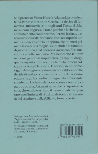 Se il professor Victor Henrik Askenasi, proveniente da Parigi e diretto in Grecia, ha deciso di fermarsi a Dubrovnik, e forse perché e li che ha un appuntamento con il destino. Perché li, forse, trovera la risposta alla domanda che da sempre lo tormenta– quella che lo ha spinto, alcuni mesi prima, a lasciare sua moglie, i suoi studi e la cattedra di greco antico, e ad andare a vivere con Eliz, una equivoca ballerina russa. Ma nemmeno lei, pur nella sua generosa impudicizia, ha saputo dargli quella risposta: Eliz non era la meta, poteva soltanto indicargli la strada. E adesso, in un pomeriggio di maggio eccezionalmente caldo, allorché decide di andare a bussare alla porta della sconosciuta che gli ha rivolto uno sguardo provocante chiedendo la chiave della sua stanza a voce appena troppo alta, Askenasi sente che la risposta e vicina, che e infine arrivato il momento di oltrepassare quel limite al di la del quale forse c’e l’oscurita del crimine e della follia – o forse la verita.