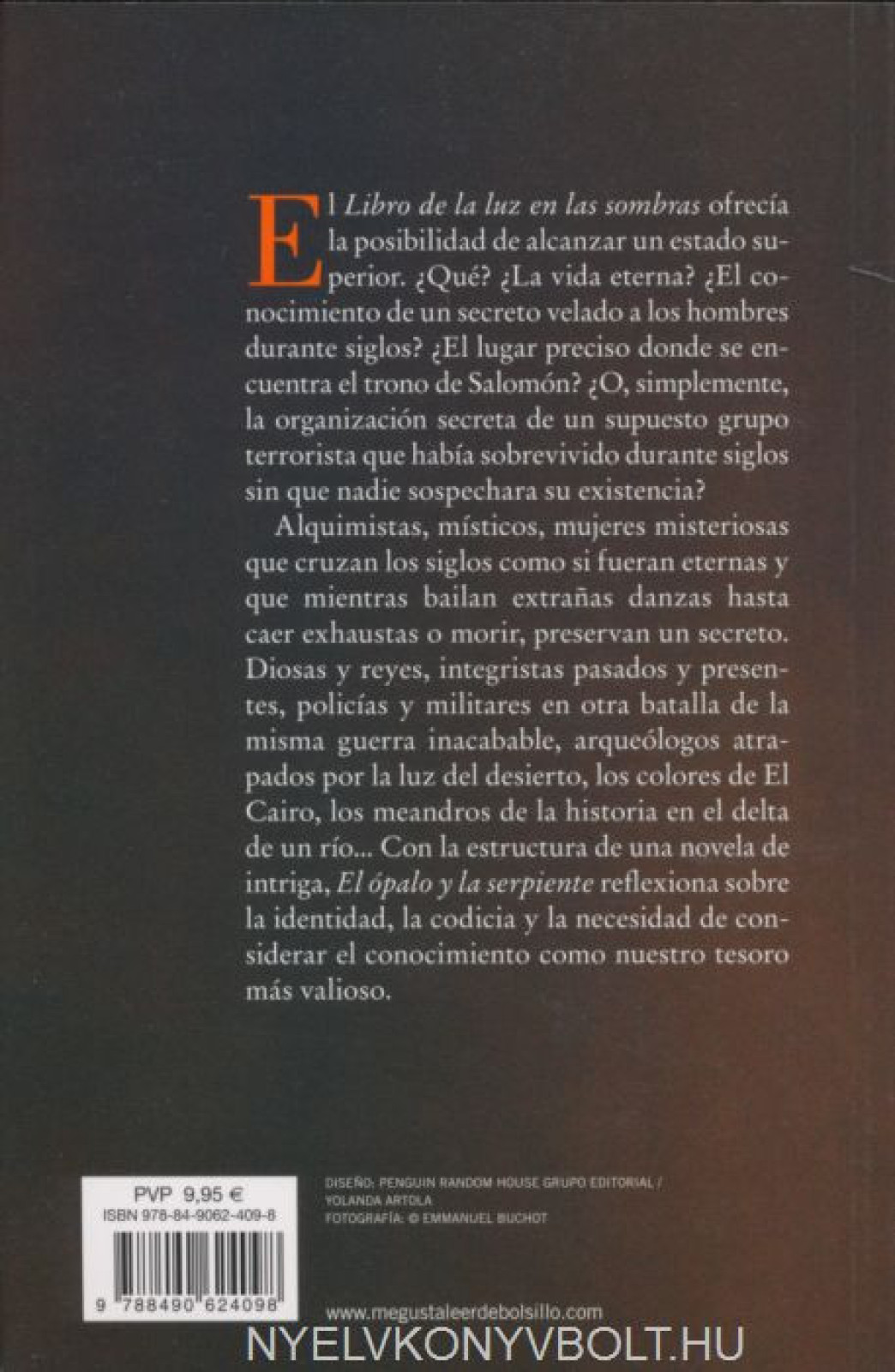 Alquimistas, místicos, mujeres misteriosas que cruzan los siglos como si fueran eternas y que mientras bailan extranas danzas hasta caer exhaustas o morir, preservan un secreto. Diosas y reyes, integristas pasados y presentes, policías y militares en otra batalla de la misma guerra inacabable, arqueólogos atrapados por la luz del desierto, los colores de El Cairo, los meandros de la historia en el delta de un río... Con la estructura de una novela de intriga, El ópalo y la serpiente reflexiona sobre laidentidad, la codicia y la necesidad de considerar el conocimiento como nuestro tesoro más valioso.