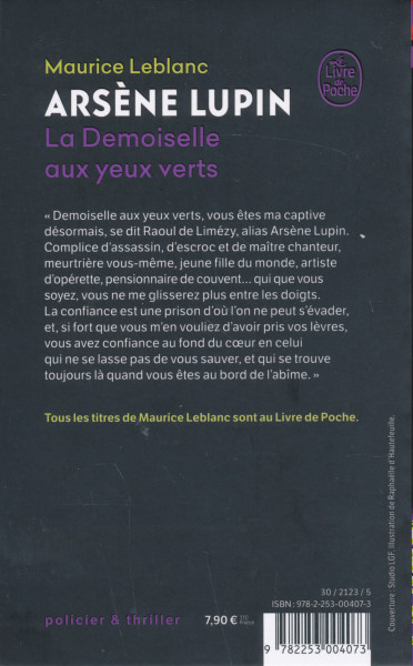 «Demoiselle aux yeux verts, vous etes ma captive désormais, se dit Raoul de Limézy, alias Arsene Lupin. Complice d’assassin, d’escroc et de maître chanteur, meurtriere vous-meme, jeune fille du monde, artiste d’opérette, pensionnaire de couvent… Qui quevous soyez, vous ne me glisserez plus entre les doigts. La confiance est une prison d’ou l’on ne peut s’évader et, si fort que vous m’en vouliez d’avoir pris vos levres, vous avez confiance au fond du cour en celui qui ne se lasse pas de vous sauver, etqui se trouve toujours la quand vous etes au bord de l’abîme.»