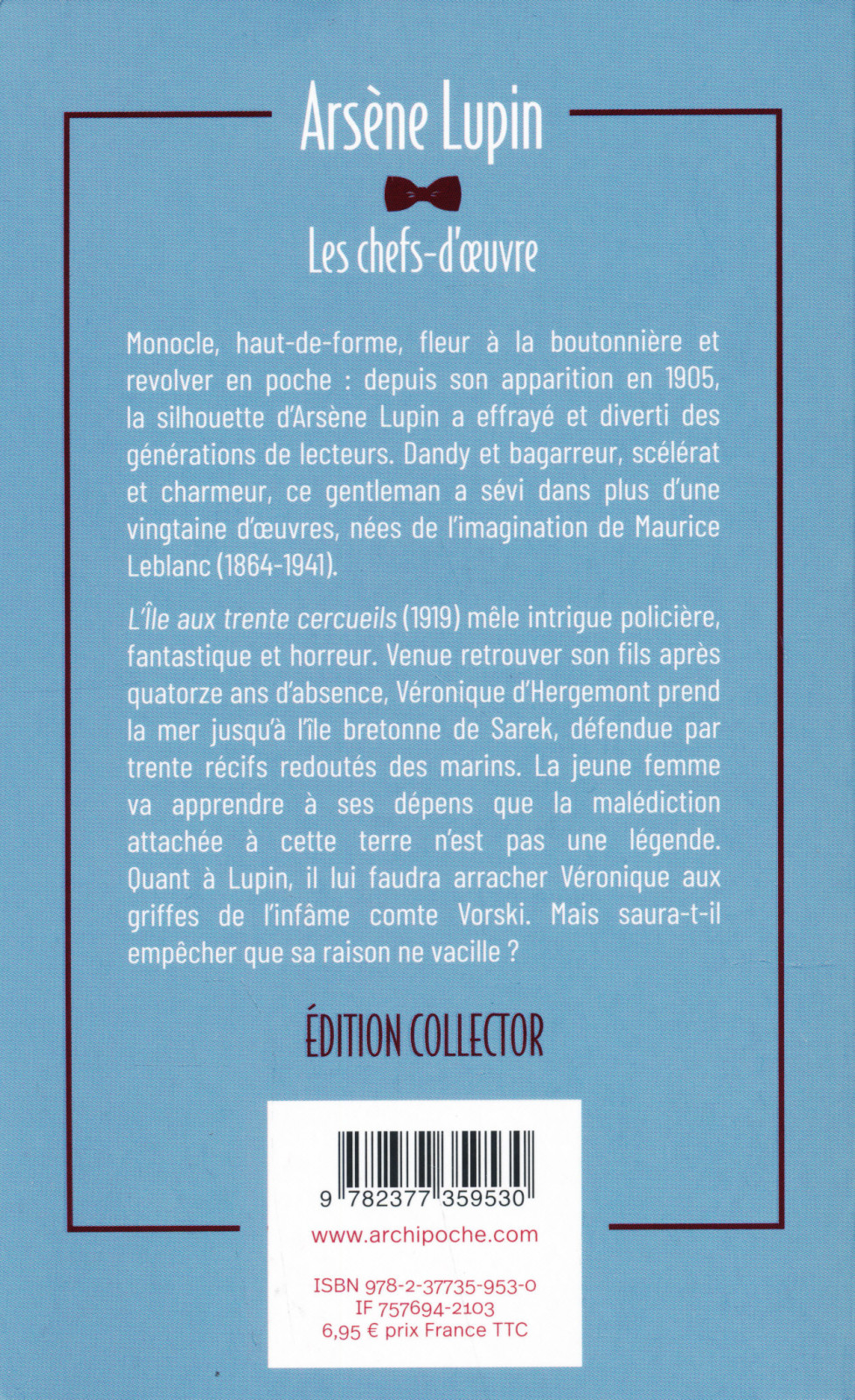 L'Île aux trente cercueils (1919) mele intrigue policiere, fantastique et horreur. Venue retrouver son fils apres quatorze ans d'absence, Véronique d'Hergemont prend la mer jusqu'a l'île bretonne de Sarek, défendue par trente récifs redoutés des marins.La jeune femme va apprendre a ses dépens que la malédiction attachée a cette terre n'est pas une légende. Quant a Lupin, il lui faudra arracher Véronique aux griffes de l'infâme comte Vorski. Mais saura-t-il empecher que sa raison ne vacille ?