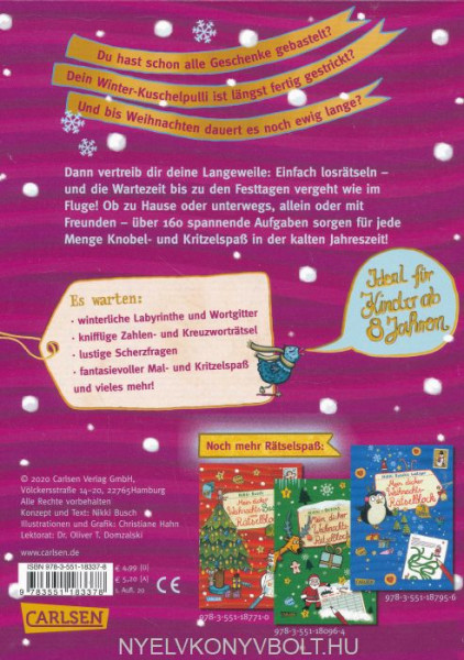 In diesem dicken Winter-Rätselblock stecken:- weihnachtliche Wortgitter und Zahlenrätsel - lustige Fehlerbilder und Quatschfragen - jede Menge Mal- und Kritzelspaß und vieles mehr!Ob zu Hause oder unterwegs, allein oder mit Freunden – ein großer Spaß für die Winter- und Weihnachtszeit!Ideal für Kinder ab 8 Jahren.