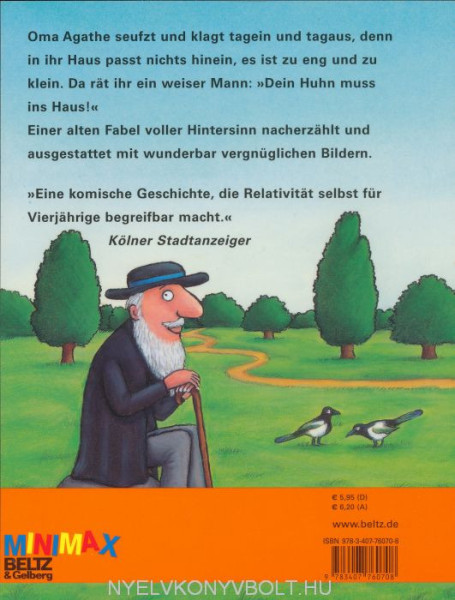 Oma Agathe seufzt tagein und tagaus, denn in ihr Haus passt nichts hinein, es ist ihr zu eng und zu klein. Aber wieso rät ihr dann ein weiser Mann, ein Huhn, eine Ziege, ein Schwein und eine Kuh bei sich aufzunehmen? Nun platzt das Haus nämlich wirklichaus allen Nähten. Doch dann rät ihr der Weise, alle wieder hinauszuwerfen – und plötzlich scheint das Haus zu wachsen! Oma Agathe ist überglücklich!