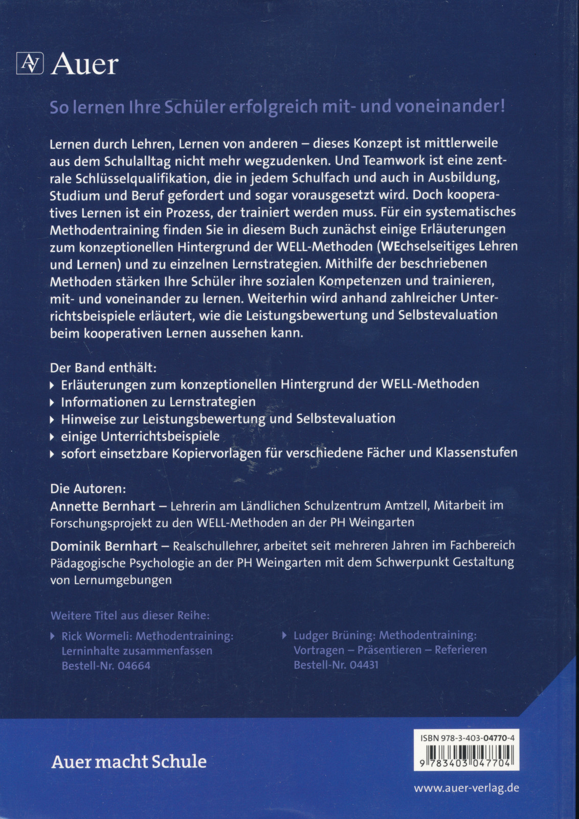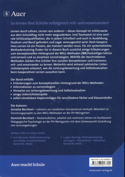 Darauf gibt Ihnen dieses Buch konkrete Antworten aus der Praxis. Mithilfe der WELL-Methoden (wechselseitiges Lehren und Lernen) setzen sich Ihre Schülerinnen und Schüler mit wichtigen Lerninhalten auseinander und stärken gleichzeitig ihre sozialen Kompetenzen, z. B. beim Gruppenpuzzle oder Partnerinterview. Für ein systematisches Methodentraining finden Sie in dem BandErläuterungen zum konzeptionellen Hintergrund der WELL-Methoden,Informationen zu Lernstrategien,Hinweise zur Leistungsbewertung und Selbstevaluation,sofort einsetzbare Kopiervorlagen für verschiedene Fächer und Klassenstufen.