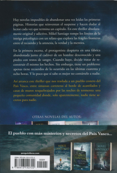 Hay novelas imposibles de abandonar una vez leídas las primeras páginas. Historias que reinventan el suspense y hacen dudar al lector cada vez que termina un capítulo. En este thriller absolutamente original y adictivo, Mikel Santiago rompe los límites de la intriga psicológica con un relato que explora las frágiles fronteras entre el recuerdo y la amnesia, la verdad y la mentira.En la primera escena, el protagonista despierta en una fábrica abandonada junto al cadáver de un hombre desconocido y una piedra con restos de sangre. Cuando huye, decide tratar de reconstruir él mismo los hechos. Sin embargo, tiene un problema: no recuerda apenas nada de lo ocurrido en las últimas cuarenta y ocho horas. Y lo poco que sí sabe es mejor no contárselo a nadie.Así arranca este thriller que nos traslada a un pueblo costero del País Vasco, entre sinuosas carreteras al borde de acantilados y casas de muros resquebrajados por las noches de tormenta: una pequena comunidad donde, solo aparentemente,...