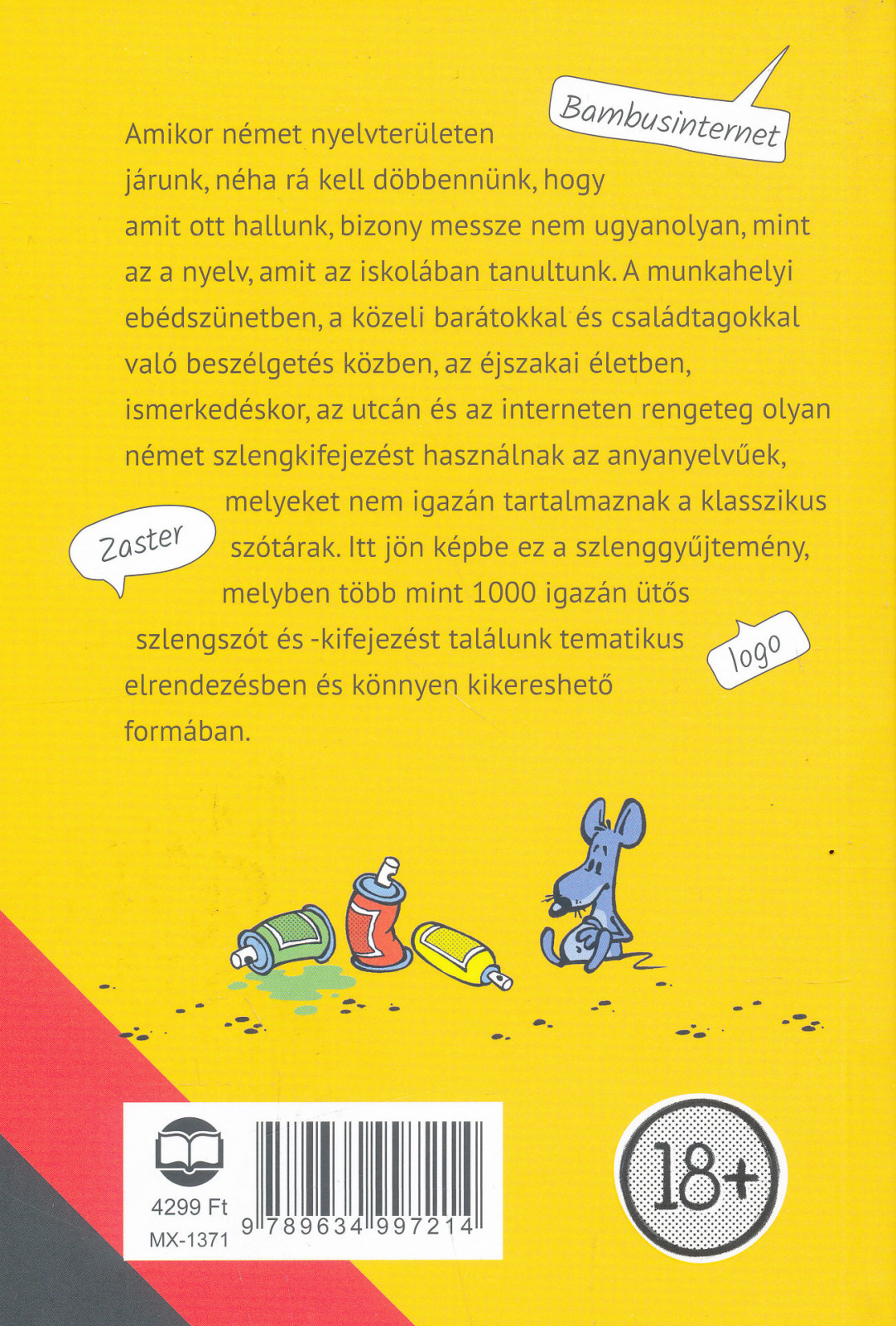 Amikor német nyelvterületen járunk, néha rá kell döbbennünk, hogy amit ott hallunk, bizony messze nem ugyanolyan, mint az a nyelv, amit az iskolában tanultunk. A munkahelyi ebédszünetben, a közeli barátokkal és családtagokkal való beszélgetés közben, azéjszakai életben, ismerkedéskor, az utcán és az interneten rengeteg olyan német szlengkifejezést használnak az anyanyelvűek, melyeket nem igazán tartalmaznak a klasszikus szótárak. Itt jön képbe ez a szlenggyűjtemény, melyben több mint 1000 igazán ütős szlengszót és -kifejezést találunk tematikus elrendezésben és könnyen kikereshető formában.