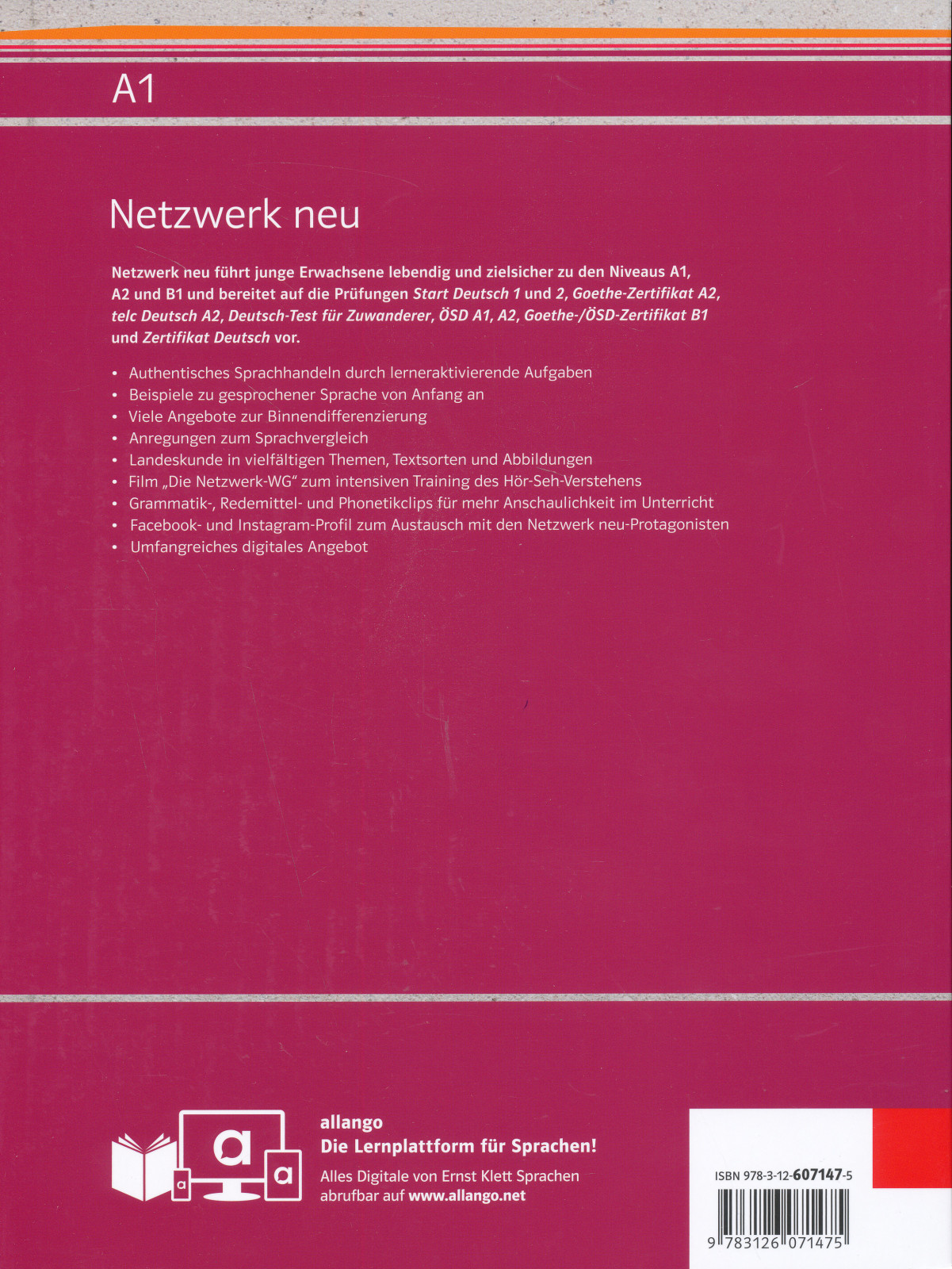 So steht Ihnen das Buch auf der Lernplattform allango auch digital zur Verfügung und Sie haben digitale Medieninhalte sofort griffbereit.Netzwerk neu führt junge Erwachsene lebendig und zielsicher zu den Niveaus A1, A2 und B1 und bereitet auf die Prüfungen Start Deutsch 1 und 2, Goethe-Zertifikat A2, telc Deutsch A2, Deutsch-Test für Zuwanderer, ÖSD A1, A2, Goethe-/ÖSD-Zertifikat B1 und Zertifikat Deutsch vor.Authentisches Sprachhandeln durch lerneraktivierende AufgabenBeispiele zu gesprochener Sprache von Anfang anVielfältige Angebote zur BinnendifferenzierungAnregungen zum SprachvergleichLandeskunde in vielfältigen Themen, Textsorten und AbbildungenFilm „Die Netzwerk-WG“ zum intensiven Training des Hör-Seh-VerstehensGrammatik-, Redemittel- und Phonetikclips für mehr Anschaulichkeit im Unterricht