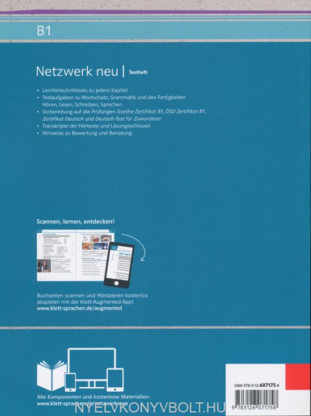 A Netzwerk neu B1 tesztkönyve nemcsak azoknak a tanároknak nyújt segítséget, akik az órákon résztvevők aktuális szintjét szeretnék felmérni, hanem azoknak a tanulóknak is, akik önállóan tesztelnék tudásukat.-összefoglaló teszt minden fejezet végéntesztfeladatok a szókincshez, nyelvtanhoz és alapkészségekhez (hallás, olvasás, írás, beszéd)-vizsgafelkészítők (Goethe-Zertifikat B1, ÖSD Zertifikat B1, Zertifikat Deutsch und Deutsch-Test für Zuwanderer)-hanganyagok átirata és megoldókulcsa-értékelési- és pontozási javaslatok ?
