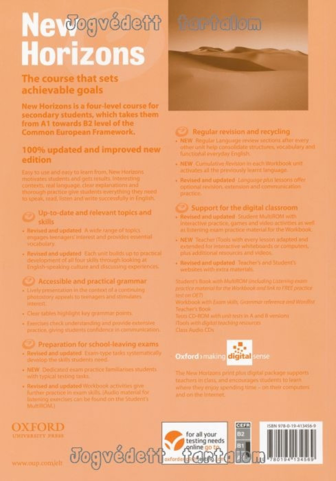 New Horizons is a four-level upper secondary course that sets achievable goals and builds confidence. <Enter>New Horizons includes 100% new content and updated exam training to prepare students for the B1 school-leaving exam.