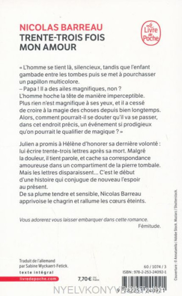 « L’homme se tient la, silencieux, tandis que l’enfant gambade entre les tombes puis se met a pourchasser un papillon multicolore.– Papa ! Il a des ailes magnifiques, non ?L’homme hoche la tete de maniere imperceptible. Plus rien n’est magnifique a ses yeux, et il a cessé de croire a la magie des choses depuis bien longtemps. Alors, comment pourrait-il se douter qu’il va se passer, dans cet endroit précis, un événement si prodigieux qu’on pourrait le qualifier de magique ? »Julien a promis a Hélene d’honorer sa derniere volonté : lui écrire trente-trois lettres apres sa mort. Malgré la douleur, Julien tient parole et cache sa correspondance amoureuse dans un compartiment de la pierre tombale. Mais les lettres disparaissent… C’est le début d’une histoire qui conjugue de nouveau l’espoir au présent.