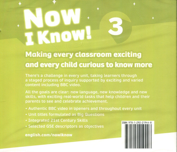 What makes Now I Know special?• Authentic BBC video (using CBBC clips) in openers and throughout every unit. Each level contains around 48 video clips (4 per Unit).• Big Questions provided as unit titles give meaningful context for conversation and language tasks.• 21st Century Skills embedded throughout the course help students develop essential skills for life and support classroom management.• Mapped to the Global Scale of English. GSE descriptors are used as objectives and for self-assessment in every unit, so it's easy to track progress.• 2 reading texts per unit: 1 fictional (presenting values) and 1 factual (helping students learn about the world)• Speaking strategies from Level 1 help students develop all aspects of communication from the earliest stages of learning English.• Now I Know! page provides tasks to consolidate information gathered on the Big Question as well review language objectives. • Exam practice for PTE YL, CYL, Key and Preliminary exams.