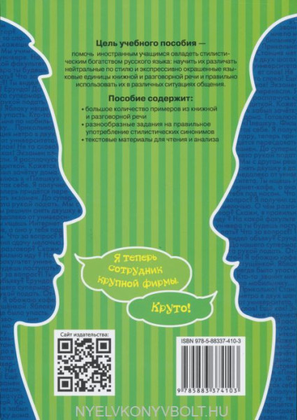 Kniga predstavljaet soboj uchebnoe posobie po prakticheskoj stilistike i razvitiju rechi dlja inostrantsev,izuchajuschikh russkij jazyk,imejuschikh bazovuju jazykovuju podgotovku i prodolzhajuschikh rasshirjat i sovershenstvovat vladenie russkim jazykom.